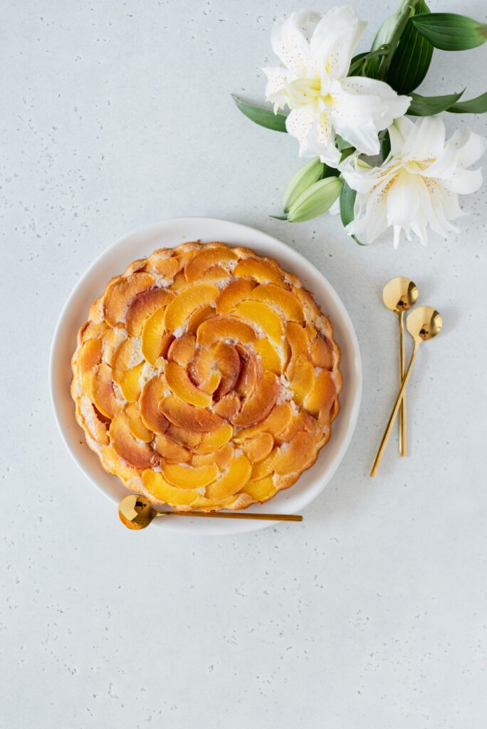 Commencez d’abord par retirer les noyaux de vos pêches et tranchez-les en minces tranches. Ensuite, déposez les tranches de pêches au fond de votre moule à gâteau rond, préalablement vaporisé d’huile d’olive ou de noix de coco, en les disposant pour former une fleur tout au fond.
