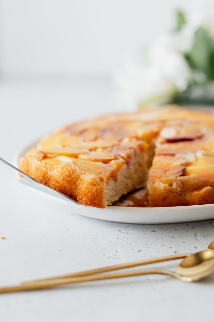 Puisque la saison des pêches bat son plein, cette semaine, je vous ai cuisiné un délicieux gâteau sans gluten, renversé aux pêches.