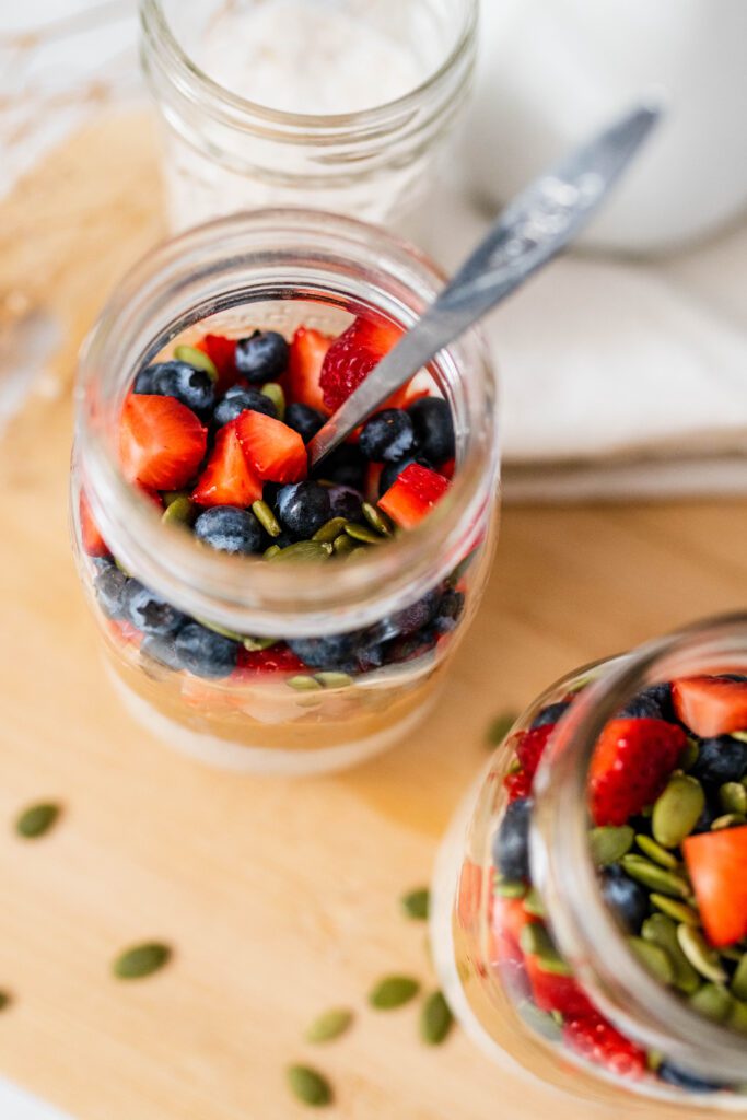 Ensuite, diviser en trois parts égales le mélange et remplissez 3 pots de votre choix. Ajoutez votre beurre d’arachide, les fraises coupées, les graines de citrouille et plus de sirop d’érable si vous le souhaitez. Couvrir et laisser au frigo pour les matins.