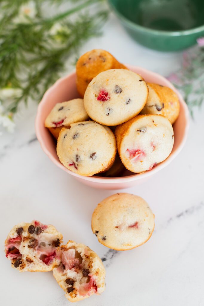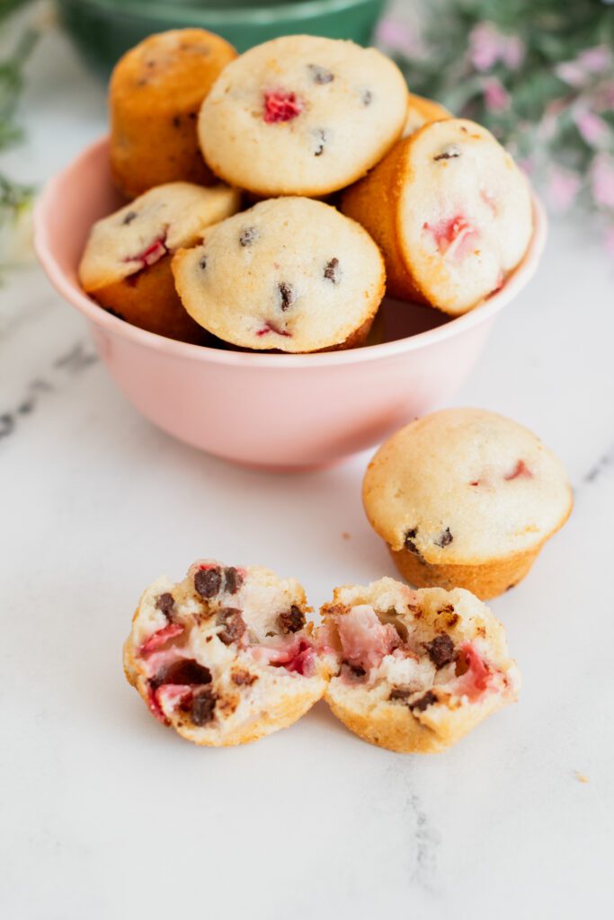 Voici donc une recette facile et rapide de mini muffins à la fraises et mini pépites de chocolat pour les écoliers affamés.