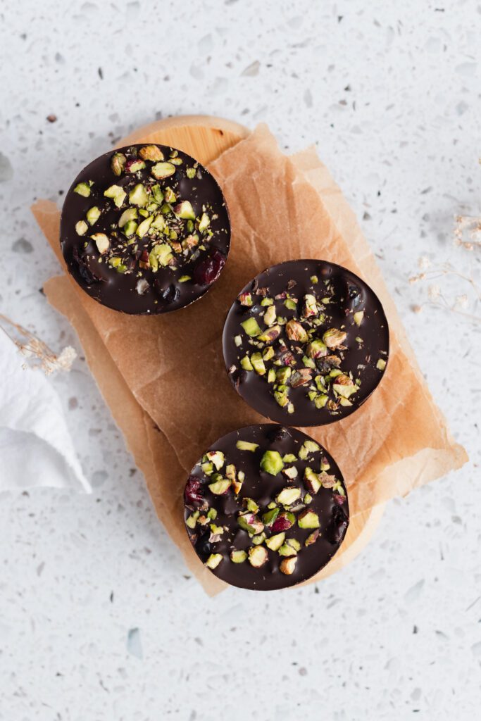 Faire fondre le chocolat noir et verser sur les fonds. Ajouter les garnitures de votre choix avant le chocolat et/ou sur le dessus.